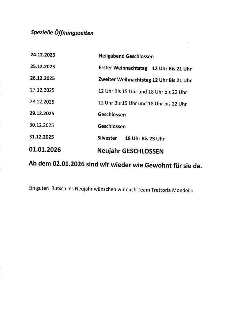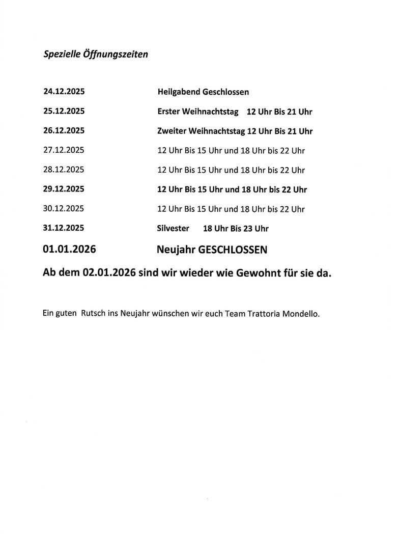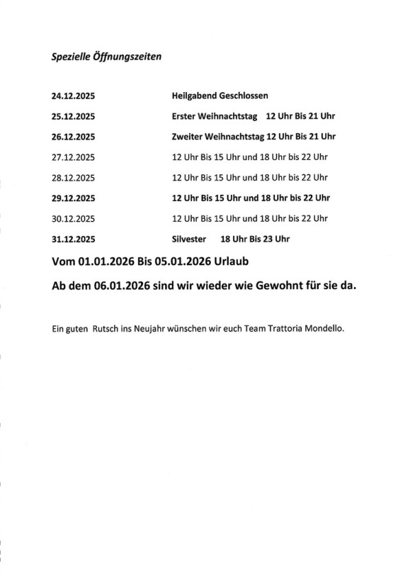 Öffnungszeiten an den Feiertagen und Neujahr.